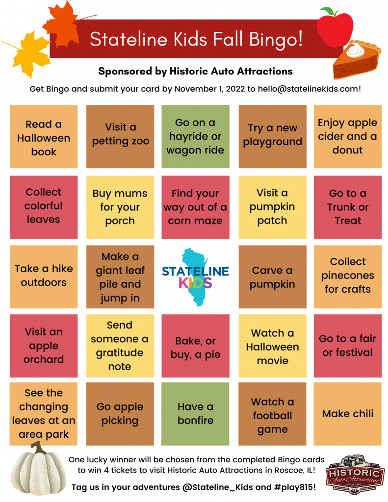 Once you’ve gotten Bingo, snap a picture of your card and send it hello@statelinekids.com for a chance to win four tickets to visit Historic Auto Attractions in Roscoe, Illinois!