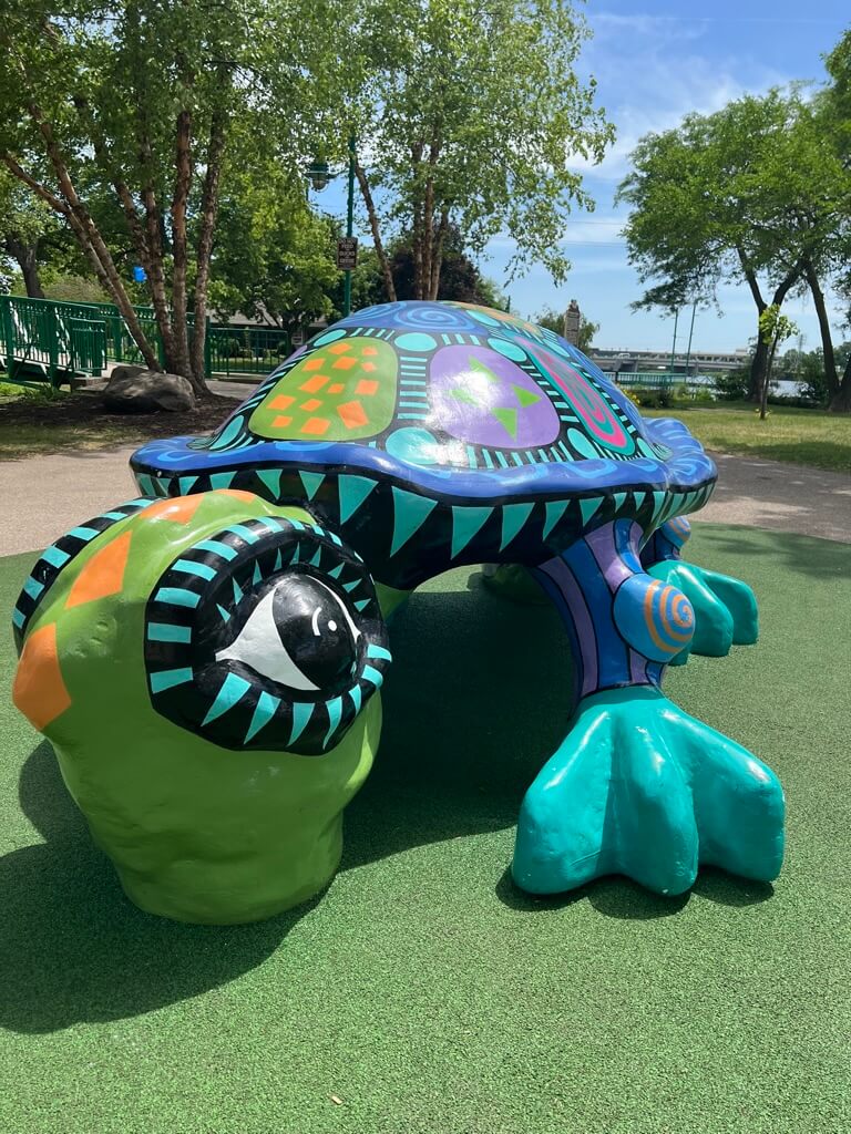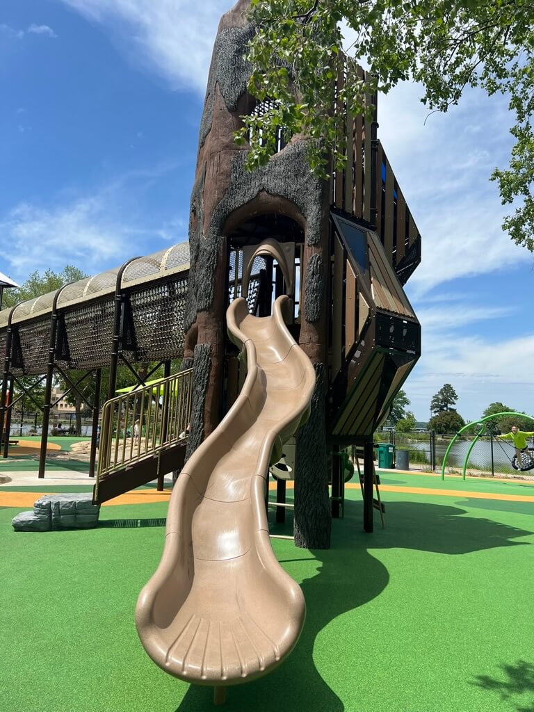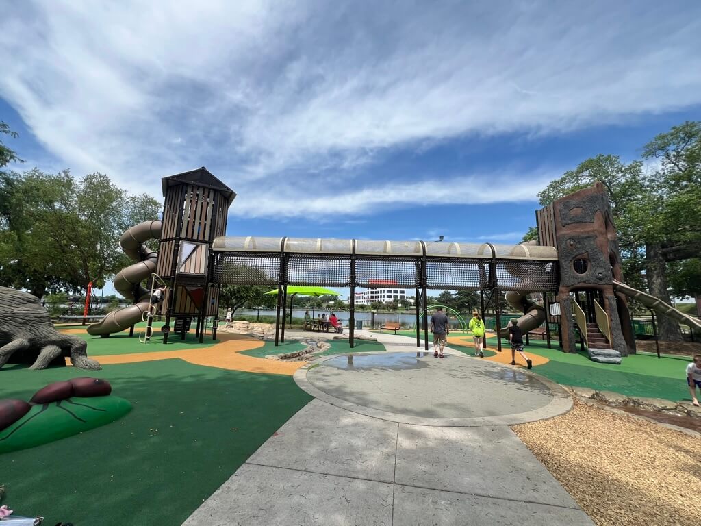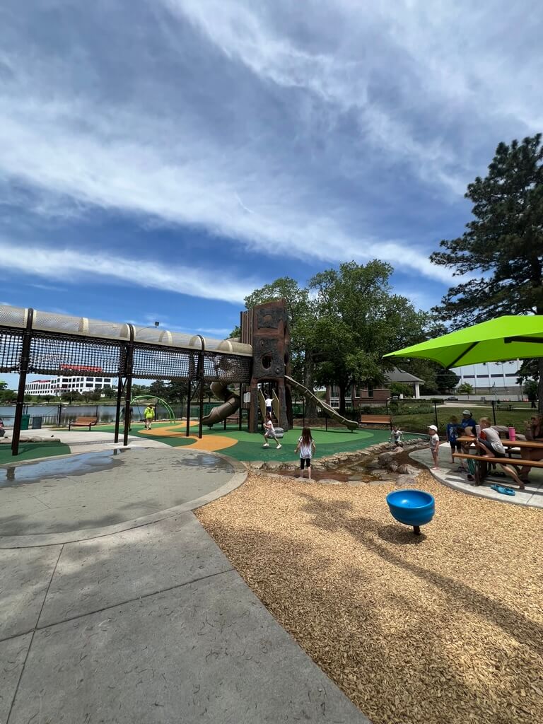 Turtle Island Playground is great for children aged two through twelve. There are several different play areas where kids can explore and imagine: climbing log, lookout tower with multiple slides, toddler playground, and a shallow man-made creek. There are also spinning cups, a spinning climbing tower, and web swing. The renovations in 2025 have made more of the playground accessible with rubber flooring. Turtle Island Playground offers hours of fun for kids of all ages.