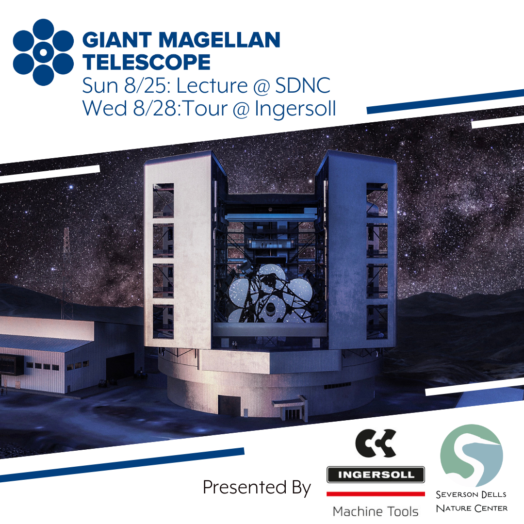 The Giant Magellan Telescope (GMT) is the largest telescope of its kind, using seven of the world’s biggest mirrors to look deeper into space than ever before. While it will sit on a mountain peak in Chile’s Atacama Desert, it is being manufactured in part at Rockford’s very own Ingersoll Machine Tools! Learn all about this incredible feat from GMT Project Manager William Burgett in an awe-inspiring lecture at Severson Dells. Free for members, $5/non-members. https://