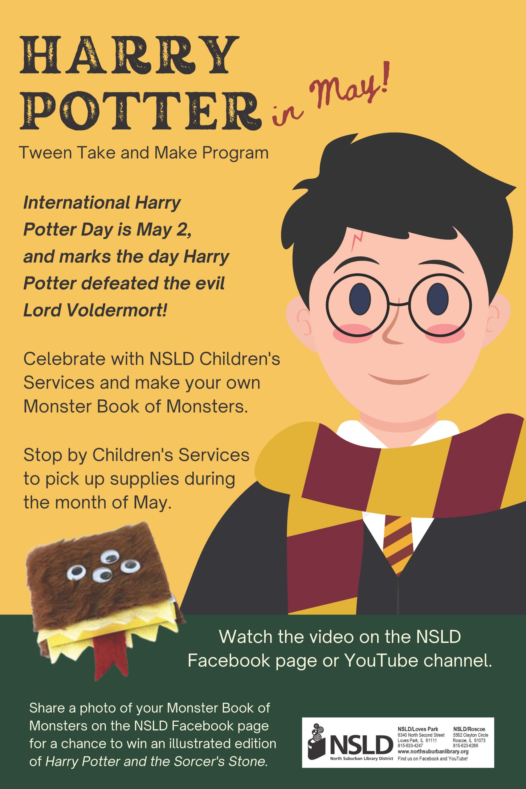 North Suburban Library District is celebrating Harry Potter’s victory against Lord Voldemort all month with a Tween Take and Make project! Tweens can stop by Children’s Services at either branch to pick up supplies to make their own Book of Monsters! Then they can watch the video on the NSLD Facebook page to learn how to assemble it. If they share a photo of their complete Book of Monsters they’ll get a chance to win an illustrated edition of Harry Potter and the Sorcerer’s Stone.