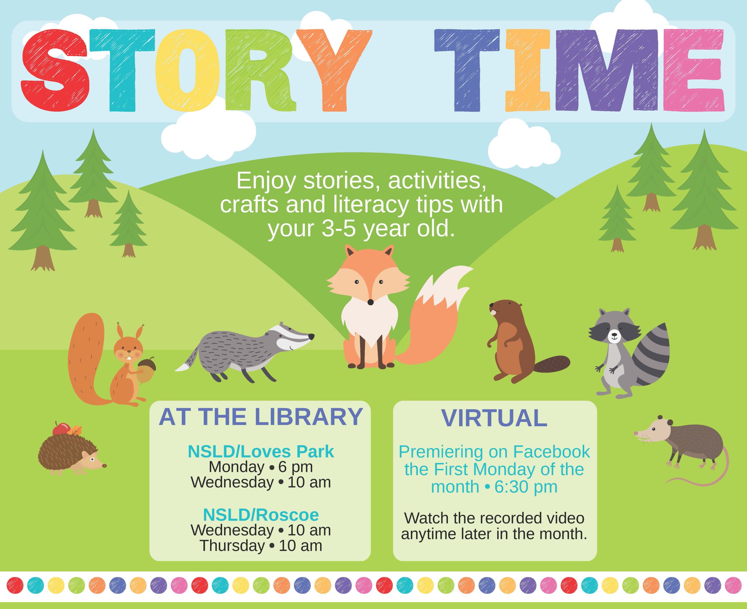 Kids ages 3-5 can enjoy stories, activities, crafts, and literacy tips. These events happen at the Loves Park location on Monday at 6 pm and Wednesday at 10 am and at Roscoe on Wednesday at 10 am and Thursday at 10 am. They are also available on Facebook.