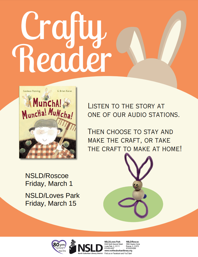 Head to North Suburban Library to listen to Muncha Muncha Muncha on one of the audio stations then choose to stay and make the craft or take the craft to Continue Reading