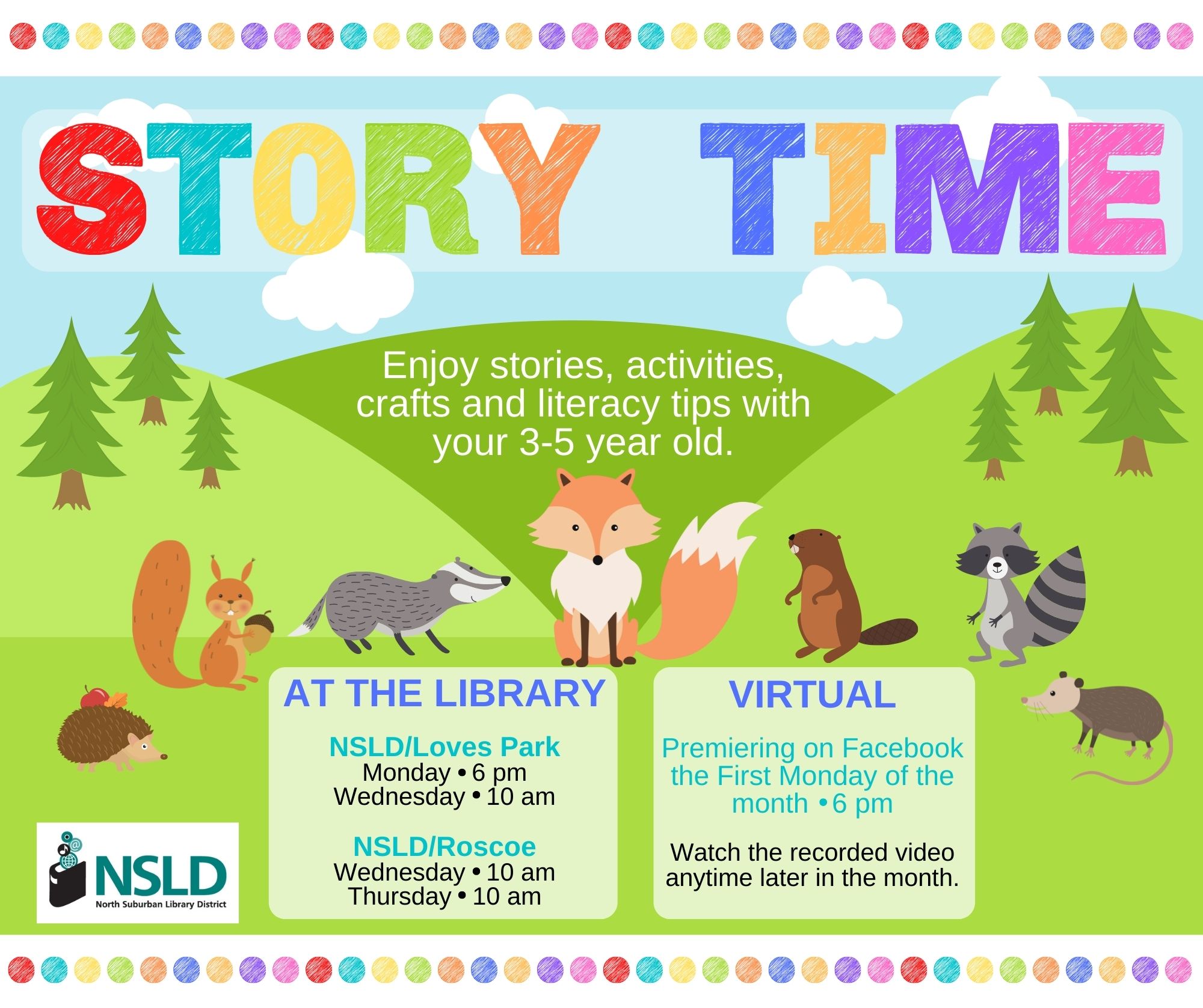 Kids ages 3-5 can enjoy stories, activities, crafts, and literacy tips. Story times are held weekly at the Loves Park branch on Mondays at 6 pm and Wednesday at 10 Continue Reading